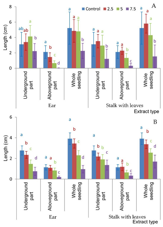 The research conducted revealed differences not only in seed and grain germination but also in seedling elongation under the influence of aqueous extracts of H. murinum subsp. murinum. The elongation growth of whole F. rubra seedlings was significantly lower when watered with extracts from the ear and stalk with leaves at the concentration of 7.5%, but the growth of the aboveground part was significantly inhibited even with extracts from the ear at ≥2.5% and extracts from the stalk with leaves at ≥5% (Figure 3A, Figure 4 and Figure 5).