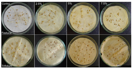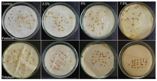 White clover seeds and red fescue grains (separately) were sterilized in 1% acetone solution for 1 min and then rinsed three times with distilled water. Twenty-five seeds and grains each were placed on sterile Petri dishes with three layers of blotting paper moistened with an appropriate extract of wall barly. The control consisted of seeds and grains placed in Petri dishes with blotting paper moistened only with distilled water. The seeds and grains in the Petri dishes were placed in the dark, at a room temperature of 23 °C ± 2 °C, and a relative humidity of approximately 60–70%. Every 24 h for 7 days (for clover seeds) and 14 days (for fescue grains), the number of germinated seeds and grains was checked. The experiment was carried out in three replicates for each concentration and type of barley extract and control. Based on this, the germination percentage (GP) was determined according to the formula: