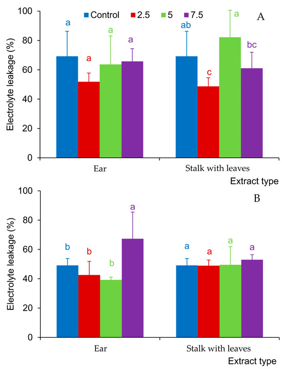 The extracts from the stalk and leaves reduced the degree of destabilization of the cell membranes of the F. rubra seedlings at the concentration of 2.5% (Figure 4A), and in clover, they did not cause significant changes in the electrolyte leakage from the analyzed seedlings (Figure 4B). Ear extracts did not have a significant effect on electrolyte leakage in F. rubra seedlings (Figure 6A). In the case of white clover, they increased the electrolyte leakage in seedlings only at the concentration of 7.5% (Figure 6B).