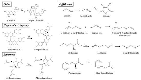 Oxidation of flavan-3-ols, isohumulones, and precursors of odorants, impacting color, haze, astringency, bitterness, and flavor.