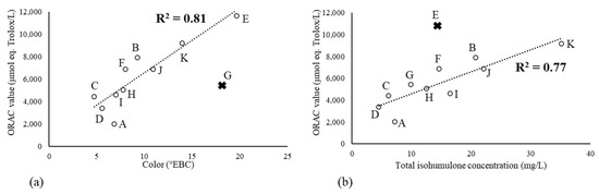 Interestingly, beers E and K exhibited the highest values (11,637 and 9193 μmol eq. Trolox/L, respectively), likely due to the use of special/colored malts known to contain antioxidant melanoidins [11]. As shown in Figure 3a, a correlation was observed between the ORAC value and color (R2 = 0.81 if the red fruit wheat beer G was not included).