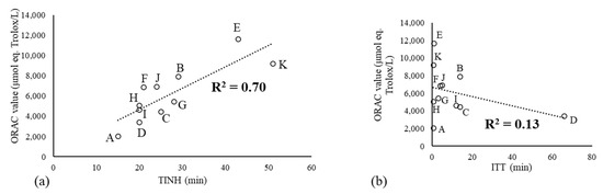 Correlations for fresh NABLABs between ORAC values and (a) TINH or (b) ITT values (letter: name of sample).