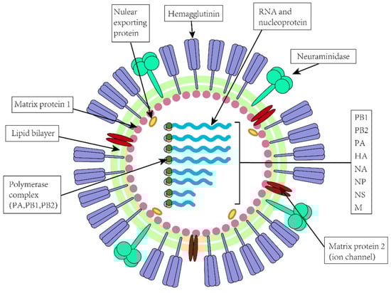 The influenza virus is a negative, single-stranded RNA virus belonging to the Orthomyxoviridae family [10]. Its genome is about 13.6 kb and consists of eight independent RNA fragments of different sizes, encoding 10 proteins, respectively: HA, NA, PA (RNA polymerase subunit PA), PB1 (RNA polymerase subunit PB1), PB2 (RNA polymerase subunit PB2), nuclear protein (NP), M (membrane proteins including M1 and M2, encoded by the same RNA fragment), and NS (non-structural proteins including N1 and N2, encoded by the same RNA fragment) [11] (Figure 1). According to the NP and membrane protein and their genetic characteristics, influenza virus can be divided into A, B, and C types [11]. Among them, influenza A viruses are more prone to antigenic mutations and are more variable than the other influenza viruses. Therefore, it is not only the most common and lethal type of influenza virus but also the main virus that causes seasonal or pandemic influenza. Furthermore, 18 different hemagglutinin (HA) subtypes (H1–H18) and 11 different neuraminidase (NA) subtypes (N1–N11) of influenza A viruses currently exist, which together define the influenza A virus subtype [12,13,14].