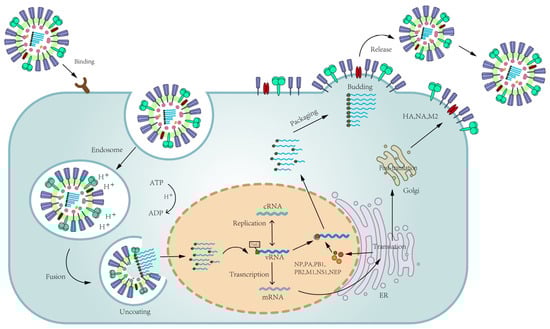 Influenza virus hemagglutinin (HA) binds to sialic acid-presenting receptors on the surface of host cell membranes. Virus particles enter the host cells to form endosomes through receptor-mediated cellular endocytosis. (2) Endosome acidification promotes conformational changes of HA, resulting in the uncoating of the virus and release of the vRNP into the cytosol of the host cell with further transportation to the nucleus. (3) vRNPs enter the nucleus to initiate the viral mRNA. HA, NA, and M2 are processed at the ER apparatus and Golgi before transport to the cell surface. Influenza virus polymerase can synthesize viral mRNA and vRNA. The vRNA is first converted into plus-strand cRNA; then the new vRNA is synthesized using cRNA as template. (4) Viral proteins and vRNA are transported to the cell surface to assemble progeny viruses and initiate the virus budding process. The progeny virus is then released from the surface of the infected cells and seeks new host cells to infect.