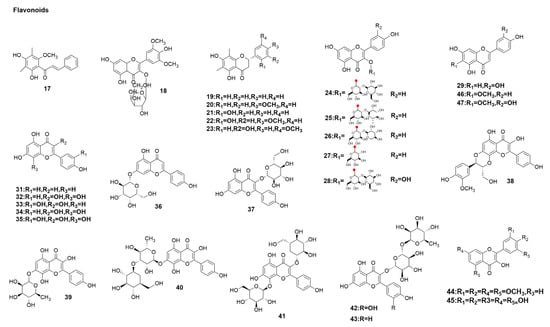 In exploring a new compound from the leaves of Cleistocalyx operculatus and its inhibitory activity against influenza A neuraminidase, Ha et al. [58] proposed that OH at the C-3′ site was replaced by methoxy, which significantly improved the inhibitory activity of flavonoids against NA. In investigating favone with six different modification groups and comparing their anti-influenza activities, Morimoto et al. [118] concluded that the modification of the B ring from the 3′ to 5′ position is important, and the hydroxyl group should preferably be at 3′ and 4′ positions rather than the 5′ position. Liu et al. [102] suggested that the increase in the number of OH groups on the B ring reduced its inhibitory effect. In 5,7,3′,4′-tetra-O-methylquercetin (44) and dihydromyricetin (45) (Figure 4), dihydromyricetin (45) with three hydroxyl groups on the B ring showed reduced activity against influenza virus compared with 5,7,3′,4′-tetra-O-methylquercetin (44). Moreover, Morimoto and Liu et al. [118,119] believed that the inhibitory effect of glycosylated flavonoid compounds would be weakened. This finding may be due to the large volume of glycosylation leading to steric hindrance or the interruption of binding sites with target enzyme activity. Therefore, we concluded that the C-7, OH, C-4′ positions, and C-4 carbon groups of flavonoid compounds are necessary to obtain good NA inhibition.