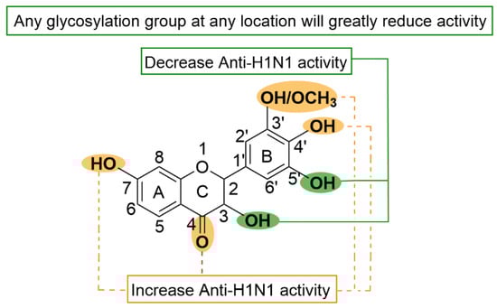 In conclusion, the above flavonoids extracted from natural products have some in vitro activities against influenza virus, and they all have anti-influenza virus activity by inhibiting NA activity (Figure 2). Therefore, the analysis of the above studies can summarize the structure–activity relationship of flavonoids on NA inhibition to elucidate the structural characteristics of flavonoids on NA inhibition, which was summarized in Figure 6. According to Liu et al. [102], in the structure–activity relationship study of flavonoid anti-influenza virus NA inhibitors, for flavonoids to have better anti-influenza virus activity, OH groups on C-7 and C-4′, a double bond between C-2 and C-3, and a carbanyl group at the C-4 position must be present. The structure of the 3′,5′-dimethylether 3-O-β-D-galactopyranoside (18) (Figure 4) exhibiting significant NA-inhibitory activity fully meets the above requirement. However, the IC50 values of demethoxymatteucinol (19), matteucinol (20), matteucin (21) (Figure 4), and other flavonoids with double bonds between C-2 and C-3 did not show significant changes in activity.