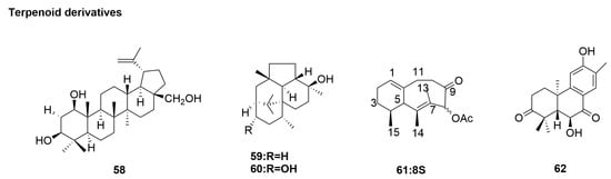 In the process of screening for novel anti-influenza virus agents from microbial metabolites, two novel diterpene compounds, wickerols A (59) and B (60) (Figure 7), were isolated from the culture broth of a fungus, Trichoderma atroviride FKI-3849, by Yamamoto et al. [73]. Wickerol showed a strong antiviral activity against the A/H1N1 flu virus (A/PR/8/34 and A/WSN/33 strains), with an IC50 value of 0.1 mg/mL (Table 1), but it was not active against the A/H3N2 virus [73].