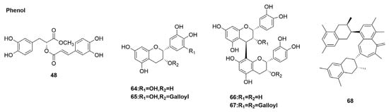 Phenolic compounds are compounds formed by the combination of one or more aromatic rings with one or more hydroxyl groups. Phenolic compounds are secondary metabolites of plants, which have been confirmed to have various significant biological activities [154], including anti-cancer, analgesic, anti-inflammatory, and antibacterial effects. Additionally, they have biological activities against diabetes mellitus, cardiovascular and cerebrovascular diseases, and influenza A virus.