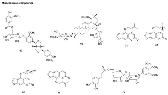 Lee et al. [82] identified four active furanocoumarins from 70% ethanol extract of Angelica dahurica (A. dahurica) root through the bioactivity-guided isolation: isoimperatorin (71), oxypeucedanin (72), oxypeucedanin hydrate (73), and imperatorin (74) (Figure 9). Among them, oxypeucedanin showed a significant CPE-inhibitory effect, which was stronger than that of the positive control, ribavirin, against H1N1, with an EC50 of 6 μM (Table 1). Oxypeucedanin inhibited the synthesis of NA and NP in a dose-dependent manner. Lee et al. [82] further studied the mechanism of oxypeucedanin and found that it interfered with the synthesis of NP and NA at the early stage of viral replication; it exerted anti-influenza activity but did not affect the virus’ entry into host cells, emergence, and release. The molecular docking analysis predicted the role of oxypeucedanin in polymerase acidic protein, which inhibits viral mRNA transcription and thus viral protein synthesis. Additionally, oxypeucedanin reduced H1N1-induced apoptosis by inhibiting the Bax/casepase-3 pathway (Figure 2).