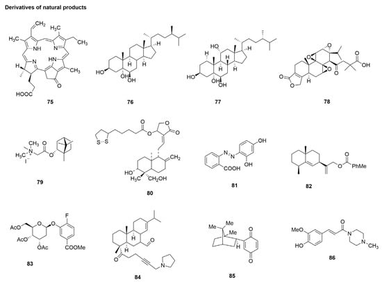 Natural products have long been an important source of many marketed drugs, with studies showing that 10% of drugs on the market are unmodified natural products, and 29% are derivatives (hemicompounds) [170]. The natural product gentiopicroside (GPS) is an annular ether terpenoid, which is widely found in gentian (Gentiana manshurica Kitag.), which is one of its active components. Although it has been shown to have anti-inflammatory activity [171], it is still very far from clinical use. To improve its bioavailability and lipid solubility, Wu et al. [83] designed and synthesized a series of new gentiside derivatives, followed by in vitro inhibition of influenza virus biological evaluation of all synthesized compounds. 2′,3′,6′-Tri-O-benzoyl-4′- O-methylsulfonyl gentiopicroside (75), 4′-fluoro-4′-deoxy gentiopicroside (76), and 2′,3′,6′-Tri-O-benzoyl-4′,5′-olefin gentiopicroside (77) (Figure 10) showed significant activity against influenza viruses, with IC50 values of 39.5 μM, 45.2 μM, and 44.0 μM, respectively (Table 1) [83]. The authors further evaluated their cytotoxicity in MDCK cells, with results indicating no cytotoxic effects on uninfected MDCK cells at a concentration of 50µM. Triptolide (TP) is one of the main active substances of mine, a commonly used Chinese medicine in China. Although recent studies have demonstrated that TP has antiviral effects [172], TP has poor water solubility and rapid elimination in vivo, and high concentrations of TP can cause multiple organ toxicity, which hinders the development of its clinical application. The TP derivatives were designed and synthesized, and their activity against influenza A viruses was evaluated by Jiang et al. [84]; the results show that 4-(((5bS, 6aS, 7aR, 8R, 8aS, 9aS, 9bS, 10aS, 10bS)-8a-isopropyl-10 bmethyl-3-oxo 1, 2,3, 5,5b, 6,6a, 8,8a, 9a, 9b, 10b dodecahydrotris(oxireno) [2′, 3′:4b, 5;2″, 3″:6, 7;2, 3‴:8a, 9] phenanthrol [1, 2-c] furan-8-yl)oxy)-2, 2-dimethyl-4 oxobutanoic acid (TPDMSA) (78) (Figure 10) is an anti-influenza virus agent mainly by inhibiting the nuclear export of the influenza virus vRNP, acting at the late stage of the H1N1 viral replication cycle, with significant inhibition of NP activity late in the H1N1 viral replication cycle by binding to the NP tail loop active site. The EC50 value of TPDMSA (78) for A/WSN/33 (H1N1) was 3.24 μM (Table 1). Anastasiya S. Sokolova et al. found high anti-influenza activity of camphor imine derivatives in a previous study [173,174,175]. A series of compounds containing a 1,7,7-trimethylbicyclo [2.2.1] heptane fragment was then studied. The results showed that N, N, N-Trimethyl-2-oxo-2-((1S,2R,4S)-1,7,7-trimethylbicy-clo [2.2.1] heptan-2-yloxy) ethanaminium iodide (79) (Figure 10) exhibited potent anti-influenza activity against influenza A (H1N1) virus in vitro, with an IC50 = 2.4µM, and showed low toxicity (CC50 = 1311µM) (Table 1) [85]. Chen et al. [86] synthesized a series of andrographolide derivatives and investigated their anti-influenza activity, which showed that AL-1 (14-alpha-lipoyl andrographolide) (80) (Figure 10) showed potent anti-influenza activity against H1N1 virus in vitro, with EC50 = 7.2 µM. Li et al.’s [87] evaluation of the anti-influenza virus activity of the 50 synthesized resveratrol derivatives showed that R42 (81) (Figure 10) not only had high inhibitory activity against NA, with an IC50 = 3.56 µM (Table 1), but also against influenza virus in MDCK cells, implying that the mechanism of anti-influenza virus activity may be through NA inhibition. Lin et al. [88] designed 23 pterodontic acid derivatives for the structural modification of pterodontic acid derivatives isolated from Laggera pterodonta (DC.) Benth. The results showed that compound 15 (82) (Figure 10) had a better activity against H1N1 virus (IC50 = 9.92 µM). Xue et al. [89] synthesized a series of substituted arylglycosides as analogues of gastrodin and evaluated their anti-influenza activity. The most effective compound was methyl 4-fluoro-3-((2S,3R,4S,5R,6R)3,4,5-triacetoxy-6-(acetoxymethyl)-tetrahydro-2H-pyran-2-yloxy) benzoate (83)] (Figure 10), which showed significant inhibitory activity against influenza A virus A/FM/1/47(H1N1), with an IC50 = 34.4 μM. Tret‘yakova et al. [90] synthesized a series of compounds of the terpene series by introducing heterocyclic fragments into the diterterpene skeleton. Among them, compound 12 (84) (Figure 10), containing pyrrolidine fragments, showed the least toxicity to influenza A virus. The antiviral activity was the highest (IC50 = 5.0μM, CC50 = 643μM) (Table 1). Chukicheva et al. [91] performed a preliminary evaluation of the antiviral activity of terpenophenols and their N or O-containing derivatives, in which 2-(1,7,7-Trimethylbicyclo [2.2.1]hept-exo-2-yl)cyclohexa-2,5-dien-1,4-dione (85) (Figure 10) was the most active influenza NA inhibitor, with an IC50 = 0.5 µM (Table 1). Cui et al. [92] designed and synthesized four series of ferulic acid derivatives, among which the most effective compound was E)-3-(4-Hydroxy-3-methoxyphenyl)-1-(4-methylpiperazin-1-yl)- prop-2-en-1-one (86) (Figure 10), with an IC50 = 12.77 ± 0.47 μg/mL (Table 1).