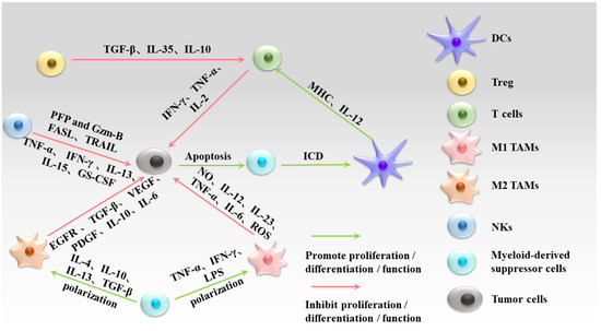 Tumor-associated immune cell interaction network. (DCs: dendritic cells; Treg: regulatory T cell; M1 TAMs: M1 tumor-associated macrophages; M2 TAMs: M2 tumor-associated macrophages; NKs: natural killer cells; TGF-β: transforming growth factor β; IL-35: interleukin 35; IL-10: interleukin 10; IFN-γ: interferon-γ; TNF-α: tumor necrosis factor α; IL-2: interleukin 12; MHC: major histocompatibility complex; ICD: immunogenic cell death; NO: nitric oxide; IL-23: interleukin 23; IL-6: interleukin 6; ROS: reactive oxygen species; LPS: lipopolysaccharide; IL-4; interleukin 4; IL-13: interleukin 13; EGFR: epidermal growth factor receptor; VEGF: vascular endothelial growth factor; PDGF: platelet-derived growth factor; PFP: perforin; Gzm-B: granzyme B).
