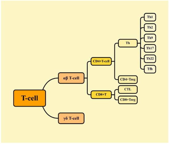 As discussed earlier, T cells are classified into αβ T cells and γδ T cells (Figure 2). αβ T cells are further divided into CD4+ T cells (helper T cells) and CD8+ T cells (cytotoxic T cells (CTLs)), both of which play crucial roles in anti-tumor immunity. Initial CD4+ T cells mature through polarization by binding to compatibility complex II (MHC II) on the cell surface of dendritic cells (DCs), macrophages, B cells and other cells. Subsequently, they assist the anti-tumor process by recruiting CD8+ T cells, promoting their proliferation and enhancing T cell effector function through the production of IFN-γ-dependent chemokines and IL-2. CD4+ T cells can differentiate into a variety of effector T cells, including Th1, Th2, Th9, Th17, Th22, regulatory T cells (Tregs) and follicular helper T cells (Tfhs). Th1 cells primarily secrete cytokines such as TNF-α, IFN-γ and IL-2, playing a crucial role in anti-tumor immunity. Th2 cells produce IL-4, IL-5, IL-10, IL-13 and IL-31, assisting B lymphocytes in producing specific antibodies for humoral immunity. The balance of Th1/Th2 is pivotal in immune response regulation, with imbalances being associated with malignancies [71]. Regulatory T cells (Tregs) are a subset of CD4+ T cells that maintain immune homeostasis and impede tumor immune surveillance by producing the chemokines TGF-β, IL-35 and IL-10 [72,73]. Initial CD8+ T cells depend on MHC I presented by antigen-presenting cells to stimulate their maturation into CTLs, enabling them to directly kill tumor cells [74,75]. γδ T cells express TCRγ and δ chains and are involved in tumor progression. γδ T cells can kill tumor cells by releasing PFP and Gzm-B or through the T cell receptor-dependent pathway (antibody-dependent cytotoxicity) [76]. γδ T cells can interact with other immune cells by secreting pro-inflammatory cytokines such as TNF-α, IFN-γ, IL-17, IL-21 and IL-22 [77]. In summary, various types of T lymphocytes play crucial roles in tumor immunotherapy.