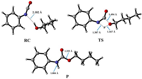 Optimized structures along the reaction pathway between phenyl isocyanate and butan-1-ol calculated at the BHandHLYP/6-31G(d) level of theory in acetonitrile at 298.15 K and 1 atm. RC—reactant complex; TS—transition state; P—product.