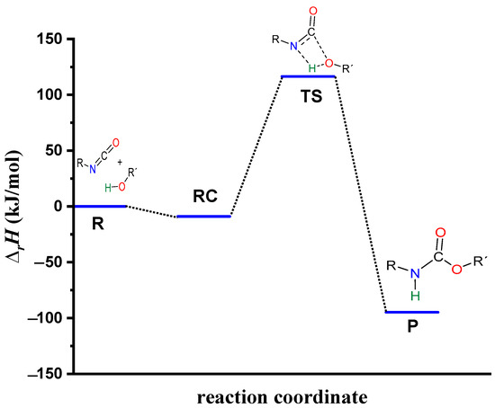 Energy profile (relative enthalpy (∆rH)) of the catalyst-free phenyl isocyanate and butan-1-ol reaction calculated using the G3MP2BHandHLYP composite method in acetonitrile, using the SMD implicit solvent model at 298.15 K and 1 atm.