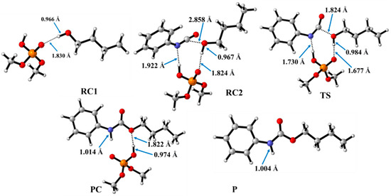 Optimized structures along the reaction pathway between phenyl isocyanate and butan-1-ol in the presence of dimethyl hydrogen phosphate (DMHP) calculated at the BHandHLYP/6-31G(d) level of theory (298.15 K and 1 atm) in acetonitrile. RC—reactant complex; TS—transition state; PC—product complex; and P—product.