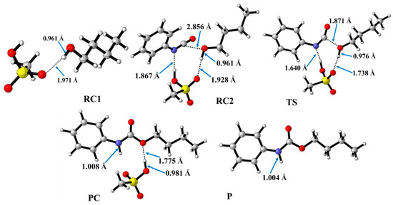 Optimized structures along the reaction pathway between phenyl isocyanate and butan-1-ol in the presence of methanesulfonic acid (MSA) calculated at the BHandHLYP/6-31G(d) level of theory (298.15 K and 1 atm) in acetonitrile. RC—reactant complex; TS—transition state; PC—product complex; and P—product.