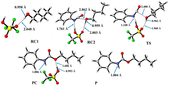 Optimized structures along the reaction pathway between phenyl isocyanate and butan-1-ol in the presence of trifluoromethanesulfonic acid (TFMSA) calculated at the BHandHLYP/6-31G(d) level of theory (298.15 K and 1 atm) in acetonitrile. RC—reactant complex; TS—transition state; PC—product complex; and P—product.