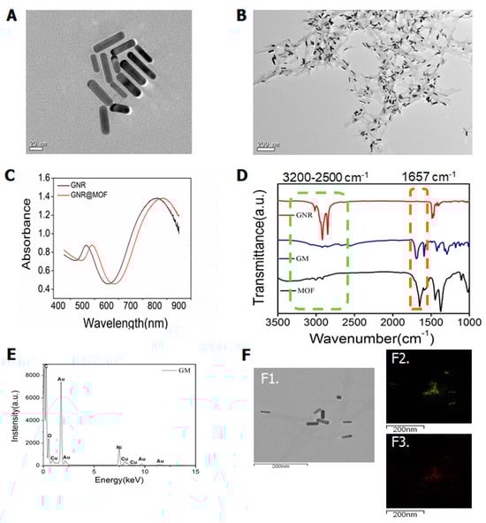 (A) Transmission electron microscopy (TEM) image of gold nanorods (GNRs); (B) TEM image of gold nanorod coated metal–organic framework (MOF) structures (GM); (C) optical extinction spectra of the colloidal Au nanorods stabilized by CTAB and coated with MOF; (D) FT-IR spectrum of GNR, GM, and MOF nanomaterials; (E) EDS spectrum of GM nanomaterials; (F) STEM-EDS elemental mapping of GM, TEM of GM (F1), Au (F2), Cu (F3).