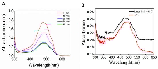 (A) UV–Vis absorption spectrum of supernatant drug after incubation with GM from 0 to 40 min; (B) UV–Vis absorption spectrum of released drug at 37 °C or with laser irradiation.