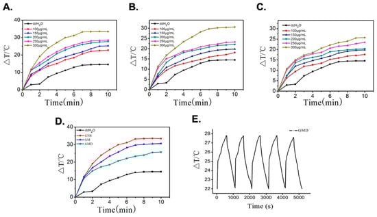 (A) Temperature profiles of GNR solution with different concentrations under laser irradiation; (B) temperature profiles of GM solution at different concentrations under laser irradiation; (C) temperature profiles of GMD solution with different concentrations under laser irradiation; (D) temperature profiles of GNR, GM, and GMD at a concentration of 300 μg/mL; (E) temperature cycling process of GMD solution in every 10-min period of radiation and 10-min period of cooling exposed to 808 nm laser.
