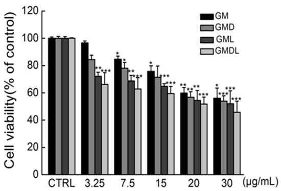 To verify the toxicity of the nanomaterials against cancer cells, the dose concentration of nanomaterials in A549 cells was screened using a 3-(4,5-dimethylthiazol-2-yl)-2,5-diphenyltetrazolium bromide (MTT) assay. GM was administered at a concentration range of 3.25–30 μg/mL, and the cell survival rate decreased gradually with increasing nanomaterial concentration, indicating that the nanomaterials had a concentration-dependent effect on A549 cells (Figure 4). When the nanomaterial concentration was 30 μg/mL, the cell survival rate was as low as 56.13 ± 7.40% (p < 0.05), indicating that GM nanomaterials at this concentration can significantly inhibit A549 cell proliferation.