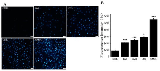 (A) Hoechst 33342 staining method, scale bar = 50 μm; (B) analysis using ImageJ (* p < 0.05, *** p < 0.001).