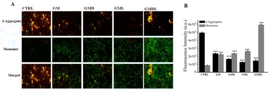 (A) Enhancement of mitochondrial membrane potential in A549 cells induced by GM, GMD, GML, and GMDL nanocarrier materials; scale bar = 50 μm. (B) analysis using ImageJ (*** p < 0.001).