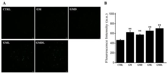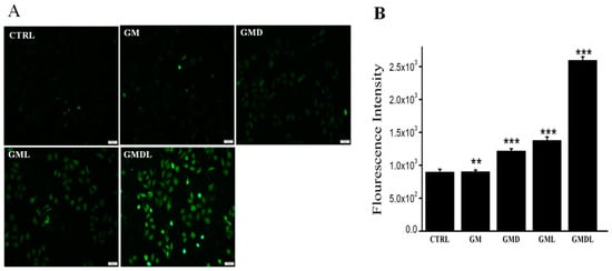 (A) Reactive oxygen species (ROS) overexpression in A549 cells induced by GM, GMD, GML, and GMDL nanocarrier materials; scale bar = 100 μm; (B) analysis using ImageJ (** p < 0.01, *** p < 0.001).