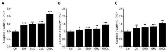 (A) Changes in caspase-3 enzyme activity for GM, GMD, GML, and GMDL nanomaterials after 24 h incubation in A549 cells (*** p < 0.01); (B) changes in caspase-8 enzyme activity for GM, GMD, GML, and GMDL nanomaterials after 24 h incubation in A549 cells (* p < 0.05, ** p < 0.01, *** p < 0.001); (C) changes in caspase-9 enzyme activity for GM, GMD, GML, and GMDL nanomaterials after 24 h incubation in A549 cells (** p < 0.01, *** p < 0.001).