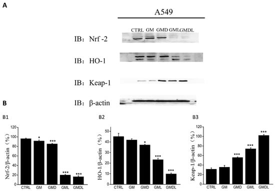 (A) Effects of GM, GMD, GML, and GMDL nanomaterials on the expression of oxidative stress signaling pathway-related proteins in A549 cells; (B) analysis using ImageJ in Nrf2 (B1), HO1 (B2), Keap1 (B3) protein expression effects (* p < 0.05, *** p < 0.001).