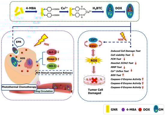 Nanomaterials can selectively target and kill cancer cells while sparing healthy tissues. Among these materials, gold nanorods (GNRs) and metal–organic frameworks (MOFs) have emerged as significant candidates because of their unique properties and potential for medical applications [4,5]. GNRs are particularly notable for their photothermal capabilities; they can convert near-infrared light into heat and effectively kill cancer cells through hyperthermia [6]. Synthesized GNRs are nanomaterials with good and stable physical and chemical properties and photothermal effects. They offer good biocompatibility, and their surfaces are easily modified, which can be enriched in tumor cells by cell uptake [7]. Developing multifunctional GNR platforms that integrate imaging, drug delivery, photothermal therapy, and other therapeutic modalities can offer comprehensive cancer treatment strategies [8]. Designing versatile GNR systems with tunable properties for personalized medicine approaches may be a promising application. After combining multiple therapies, the therapeutic effect was greatly improved, as composite materials with the ability to load drug molecules further strengthened their therapeutic effects.