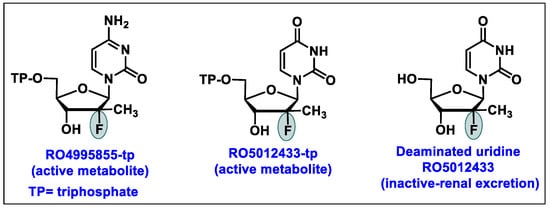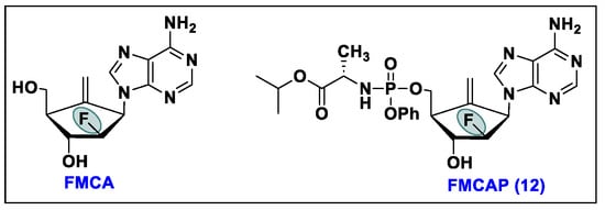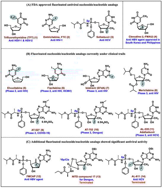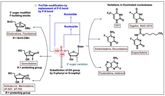 Medicinal chemists engage in the design and synthesis of modified nucleos(t)ides with an altered nucleobase or sugar to discover new nucleoside-based therapeutic agents. The altered nucleobase and sugar techniques increase the selectivity and efficacy of nucleos(t)ides against specific viral enzymes without causing toxicity to the host [3,7]. In the past two decades, much advancement has been made in the design and synthesis of modified nucleos(t)ide analogs, and these endeavors invented various new classes of nucleos(t)ide-based drugs [8]. The selective insertion of fluorine atoms in a naturally or biologically active moiety often reveals an enhanced biological profile of interest. The electronegativity of fluorine and its capacity to add an additional hydrogen bond in receptors has gained much attention in drug design. In the area of nucleos(t)ide drugs, the incorporation of a fluorine atom either in the base or sugar also demonstrates better antiviral and anticancer activities and several fluoro-nucleos(t)ide drugs are in clinics. It has been estimated that more than 20% of drug candidates and 50% of agrochemicals contain one or more F atoms [9,10].