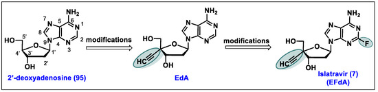 - Markowitz, M.; Sarafianos, S.G. 4′-Ethynyl-2-fluoro-2′-deoxyadenosine, MK-8591: A novel HIV-1 reverse transcriptase translocation inhibitor. Curr. Opin. HIV AIDS 2018, 13, 294–299. [Google Scholar] [CrossRef]