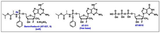 - Good, S.S.; Moussa, A.; Zhou, X.J.; Pietropaolo, K.; Sommadossi, J.P. Preclinical evaluation of AT-527, a novel guanosine nucleotide prodrug with potent, pan-genotypic activity against hepatitis C virus. PLoS ONE 2020, 15, 1. [Google Scholar] [CrossRef]