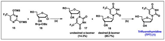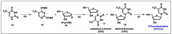 - Komatsu, H.; Umetani, H. Synthesis of Trifluorothymidine: Green Glycosylation Condition Using Neither Chloroform nor Transition Metals. Org. Process Res. Dev. 2002, 6, 847–850. [Google Scholar] [CrossRef]