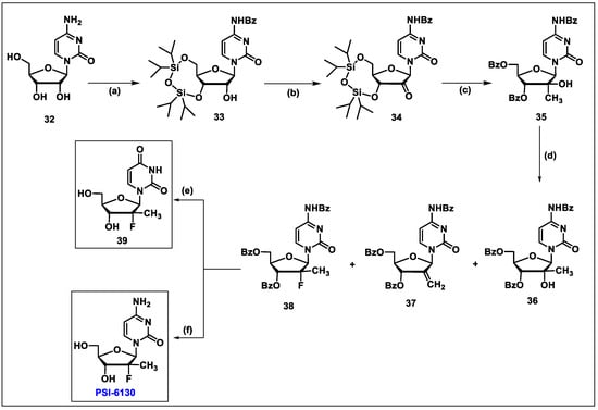 The N-glycosylation of the fluoro-containing sugar or carbocyclic ring system with nucleobases is a common strategy. The coupling of the fluorinated sugar with base or heterocycles is a preferable method, where the direct fluorination on nucleoside is either not feasible or retains low yields with fluorinating agents. There are several known modifications on ribose and carbocyclic rings at 1′,2′,3′,4′ and 5′ that have been reported [3,7]. Among these, 2-deoxy-2′-F-ribo nucleos(t)ides demonstrated potential antiviral activities. It is well known that the substitution of 2′-OH by fluorine slows or even abolishes the enzymatic catalysis of the glycosidic bond without changing the nucleoside’s original confirmation [24,25].