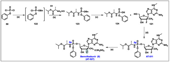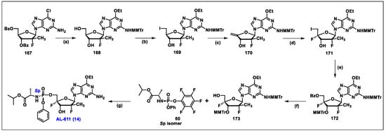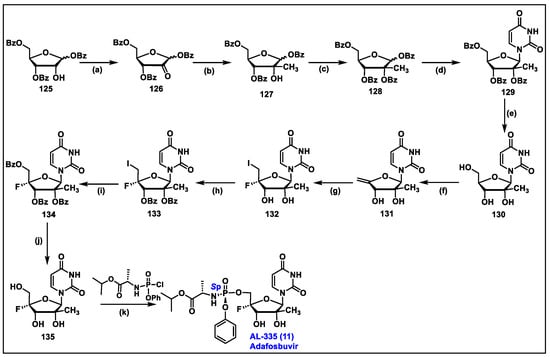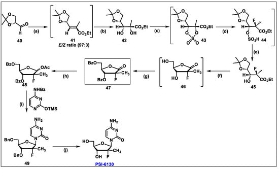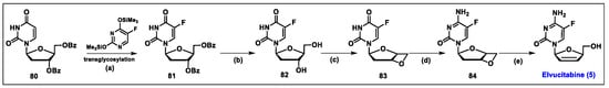 The synthesis of the 2′-deoxy-2′-β-fluoro ribanofuranose (ara-F nucleosides) and 2-deoxy-2′-α-fluoro of nucleos(t)ide analogs are well-explored in the antiviral drug discovery. The insertion of fluorine at the 2′-position of ribose or carbocyclic rings enhances the antiviral activity. The convergent approach is more frequently used in the synthesis of 2′-α/β-fluoro nucleosides. Convergent approaches allow nucleoside chemists to perform variations in the sugar or carbocyclic moieties in diverse ways. For specific nucleos(t)ides where a fluorine atom is strategically placed at either purine or pyrimidine bases (as shown in Figure 1) the desired fluorinated bases are employed in N-glycosylation reactions to synthesize the required fluorinated nucleosides. Various drugs have been introduced that contain fluorine atoms on the nucleobase and are synthesized via a convergent approach [1,3,19].