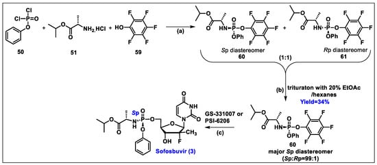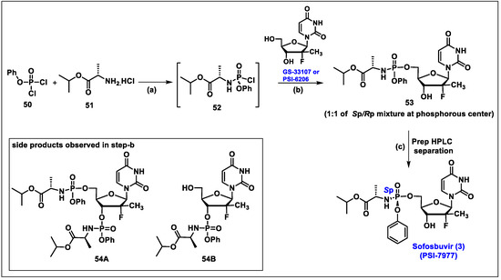 - Wang, P.; Chun, B.K.; Rachakonda, S.; Du, J.; Khan, N.; Shi, J.; Stec, W.; Cleary, D.; Ross, B.S.; Sofia, M.J. An efficient and diastereoselective synthesis of PSI-6130: A clinically efficacious inhibitor of HCV NS5B polymerase. J. Org. Chem. 2009, 74, 6819–6824. [Google Scholar] [CrossRef]