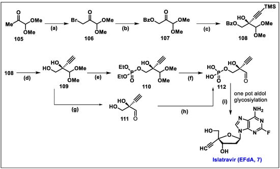 - Patel, N.R.; Nawrat, C.C.; McLaughlin, M.; Xu, Y.; Huffman, M.A.; Yang, H.; Li, H.; Whittaker, A.M.; Andreani, T.; Lévesque, F.; et al. Synthesis of Islatravir Enabled by a Catalytic, Enantioselective Alkynylation of a Ketone. Org. Lett. 2020, 22, 4659–4664. [Google Scholar] [CrossRef]