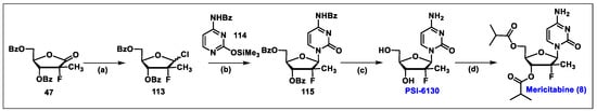 - Murakami, E.; Niu, C.; Bao, H.; Micolochick Steuer, H.M.; Whitaker, T.; Nachman, T.; Sofia, M.A.; Wang, P.; Otto, M.J.; Furman, P.A. The mechanism of action of beta-D-2′-deoxy-2′-fluoro-2′-C-methylcytidine involves a second metabolic pathway leading to beta-D-2′-deoxy-2′-fluoro-2′-C-methyluridine 5′-triphosphate, a potent inhibitor of the hepatitis C virus RNA-dependent RNA polymerase. Antimicrob. Agents Chemother. 2008, 52, 458–464. [Google Scholar] [CrossRef]