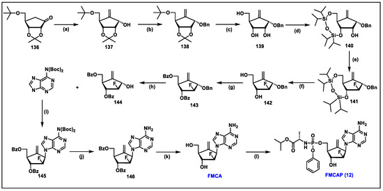 - Singh, U.S.; Mulamoottil, V.A.; Chu, C.K. Synthesis of an Anti-hepatitis B Agent, 2′-Fluoro-6′-methylene-carbocyclic Adenosine (FMCA) and Its Phosphoramidate (FMCAP). J. Org. Chem. 2019, 84, 752–759. [Google Scholar] [CrossRef] [PubMed]