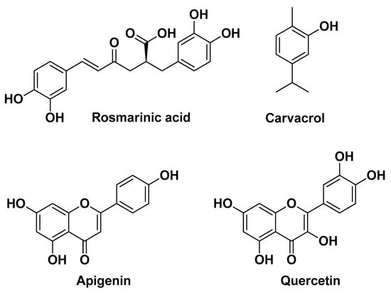 Chuang L.-T. et al. (2018) demonstrated that ethanolic extracts of Origanum vulgare L. leaves rich in phenolic compounds exert anti-inflammatory effects in human THP-1 monocytes by suppressing production and over-expression of pro-inflammatory IL-8, IL-1β, and TNF-α, in part by blocking the TLR2-mediated NF-κB signaling pathway. Moreover, these extracts significantly suppressed C. acnes-induced skin inflammation (expressed as ear thickness and biopsy weight) in in vivo mouse ear edema models after intradermal injection. Four major compounds were identified as responsible for the aforementioned biological activities, namely rosmarinic acid, quercetin, apigenin, and carvacrol (Figure 2) [8].