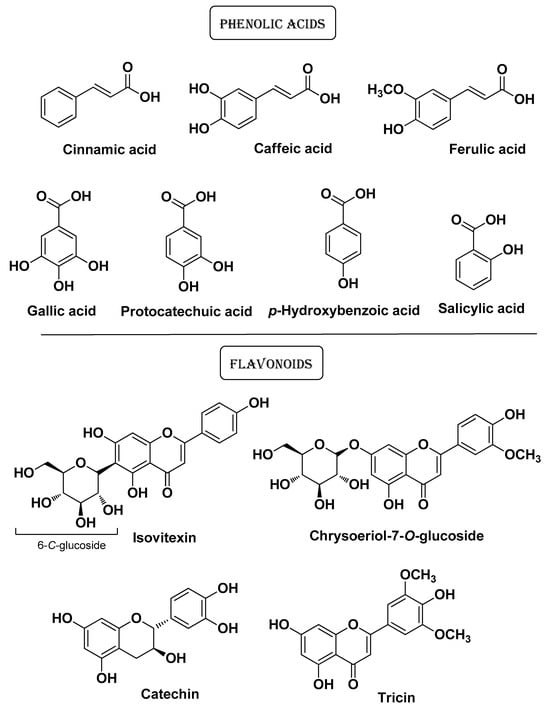 Kim C. et al. (2022) conducted a comparative study on the anti-AV potential of lemongrass (Cymbopogon citratus Stapf.) extracts. From this study, it emerged that the ethyl acetate extract has superior ROS- and NO-scavenging properties compared to 80% methanol, n-hexane, n-butanol, and water extracts. This extract also showed the highest elastase and collagenase inhibitory activity which makes it suitable for cosmeceutical applications (anti-aging properties). Its tyrosinase inhibitory activity (whitening properties) instead was comparable to those of the other extracts. The ethyl acetate fraction displayed higher lipase and antimicrobial (C. acnes) activities among extracts in line with its higher content of phenolic acids (cinnamic acid, caffeic acid, salicylic acid, p-hydroxybenzoic acid, gallic acid, ferulic acid, and protocatechuic acid) and flavonoids (isovitexin, luteolin, catechin, tricin, and chrysoeriol 7-O-glucoside) (Figure 9) [20].