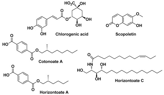 Krzemińska B. et al. (2022) studied plants of this genus in depth, highlighting their healing potential in skin diseases. In their first work, they evaluated the chemical composition and biological activity profile of Cotoneaster nebrodensis (Guss.) K. Koch and Cotoneaster roseus Collett extracts (from fruits and leaves). In vitro cell-based experiments have shown that both plant extracts possess notable antimicrobial activity without any toxicity towards skin fibroblasts. The antimicrobial potential of these extracts also depended on the solvent (or mixture of solvents) used for the extraction. These extracts also showed significant antioxidant and anti-inflammatory properties, the latter assessed as lipoxygenase, hyaluronidase, COX-1, and COX-2 inhibition. The most abundant flavonoids present in both species were quercetin derivatives (in order of quantity: quercitrin, astragalin, and isoquercitrin). Rare flavonoids (sissotrin and 5-methyl-genistein-4′-O-glucoside) were also detected in significant amounts (Figure 10). Among phenolic acid derivatives, apart from the most abundant and common chlorogenic acid, atypical compounds in leaf extracts were the aromatic esters cotonoate A and horizontoate A, and the sphingolipid horizontoate C. Scopoletin was the most abundant coumarin derivative found in these species (Figure 11) [23]. In a second work conducted in parallel, the authors studied two other species of the genus Cotoneaster, namely C. hsingshangensis J.Fryer & B.Hylmö and C. hissaricus Pojatk for which they came up with similar results [22].