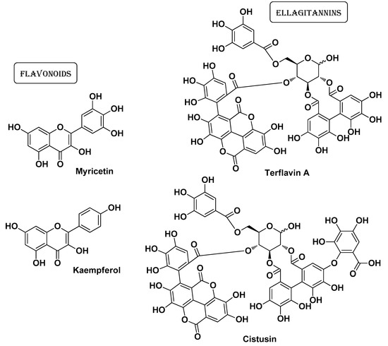 The Cistaceae are a relatively small plant family (also known as the rock-rose or rock rose family) with beautiful shrubs covered by flowers at the time of blossom. This family consists of about 170–200 species distributed mainly in the temperate areas of Europe and the Mediterranean basin, also found in North America; a limited number of species are found in South America. The genus Cistus includes fragrant species with a high content of flavonoids and bioactive terpenes, which are widely used in folk medicine for the treatment of various pathologic conditions [58]. Bouabidi M. et al. investigated the bioactivity of extracts of C. laurifolius L. and C. salviifolius L. Analysis of the chemical composition of these extracts revealed the presence of several polyphenols (especially flavonoids such as myricetin, quercetin, and kaempferol; Figure 13) and ellagitannins (mainly terflavin A and cistusin; Figure 13). The extracts also showed a good antimicrobial profile, particularly against S. aureus, S. epidermidis, and C. acnes [26].
