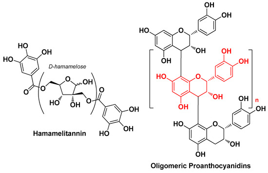 In 2022, Piazza S. et al. assessed the biological activity profile of the glycolic extract of witch hazel (Hamamelis virginiana L.) bark against C. acnes-induced inflammation. Phytochemical analysis of the extract revealed that hamamelitannin and oligomeric proanthocyanidins were the most abundant compounds (Figure 15). This extract showed inhibition of C. acnes-induced IL-6 release, partially impairing NF-κB activation, although it lacked antibacterial and antibiofilm activity. In addition, this extract showed greater anti-inflammatory activity related to the inhibition of IL-8 release than hamamelitannin, evidently due to its high proanthocyanidin content and partially mediated by antioxidant mechanisms [28].
