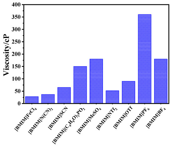 In this work, DBDS extraction efficiency of nine imidazolium-based ionic liquids, including [BMIM]BF4, [BMIM]SCN, [BMIM]NTf2, [BMIM](C4H9O)2PO2, [BMIM]N(CN)2, [BMIM]MeSO4, [BMIM]OTf, [BMIM]PF6, and [BMIM]FeCl4, was determined. Figure 1 shows that desulfurization efficiency of the nine ILs followed the order [BMIM]FeCl4 > [BMIM]N(CN)2 > [BMIM]SCN > [BMIM](C4H9O)2PO2 > [BMIM]MeSO4 > [BMIM]NTf2 > [BMIM]OTf > [BMIM]PF6 > [BMIM]BF4. The order of ionic liquids viscosity in Figure 2 is consistent with the above experimental results, except for [BMIM]NTf2, [BMIM]OTf, and [BMIM]BF4. The lower the viscosity of the ionic liquid was, the more fully it could contact transformer oils and the higher the extraction efficiency it could achieve. This result indicates that the viscosity of ionic liquid played an important role in the extraction process. However, [BMIM]FeCl4 and [BMIM]N(CN)2 with similar viscosity showed large extraction differences, which might be caused by the differences in acidity.