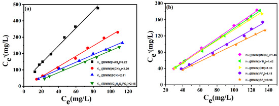 where C0 is the DBDS content in the original oil, and Ce is the DBDS content in the oil phase after extraction. Ce′ and Ce are the DBDS content in the extractant phase and oil, respectively. m0, me, and me′ are the mass of the original oil, the oil phase after extraction, and the extractant phase after extraction, respectively.