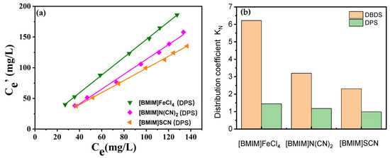 Effect of sulfur species on the extraction properties of [BMIM]FeCl4, [BMIM]N(CN)2 and [BMIM]SCN. (a) Extraction efficiency for DPS. (b) KN comparison of DBDS and DPS