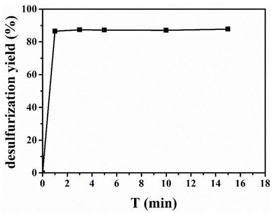 Figure 6 recorded the desulfurization efficiency of [BMIM]FeCl4 at 303 K at different times. The desulfurization efficiency was measured at 3, 5, 10, and 15 min at 303 K with the mass ratio of [BMIM]FeCl4 to oil at 1:1. As shown in Figure 6, the extraction process of [BMIM]FeCl4 reached equilibrium within 1 min, which was ascribed to low viscosity and strong acidity of [BMIM]FeCl4. On one hand, low viscosity of [BMIM]FeCl4 was beneficial to dispersion mass transfer. On the other hand, its strong acidity enhanced its chemical interaction with DBDS. Therefore, [BMIM]FeCl4 showed an excellent extractive rate, which is an important factor in the industrial extraction process.